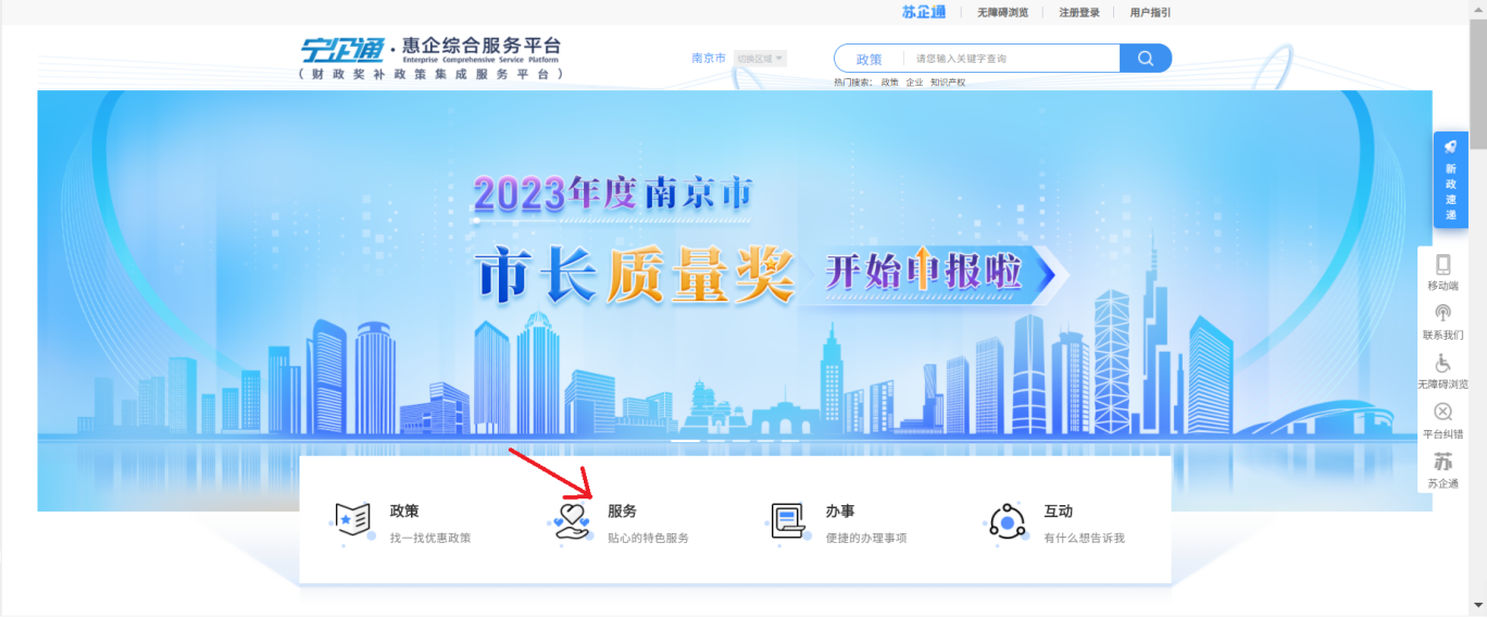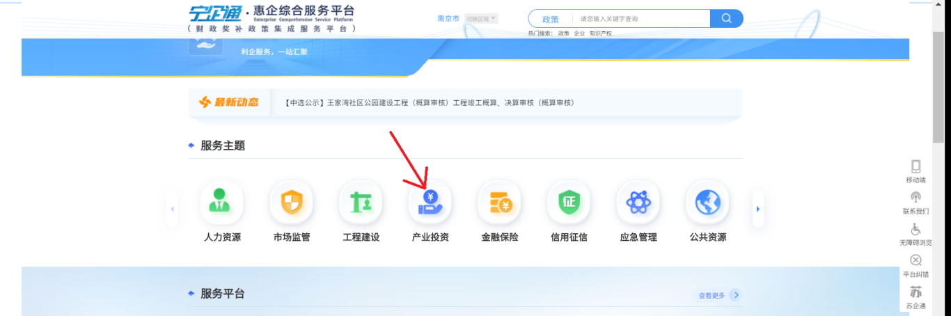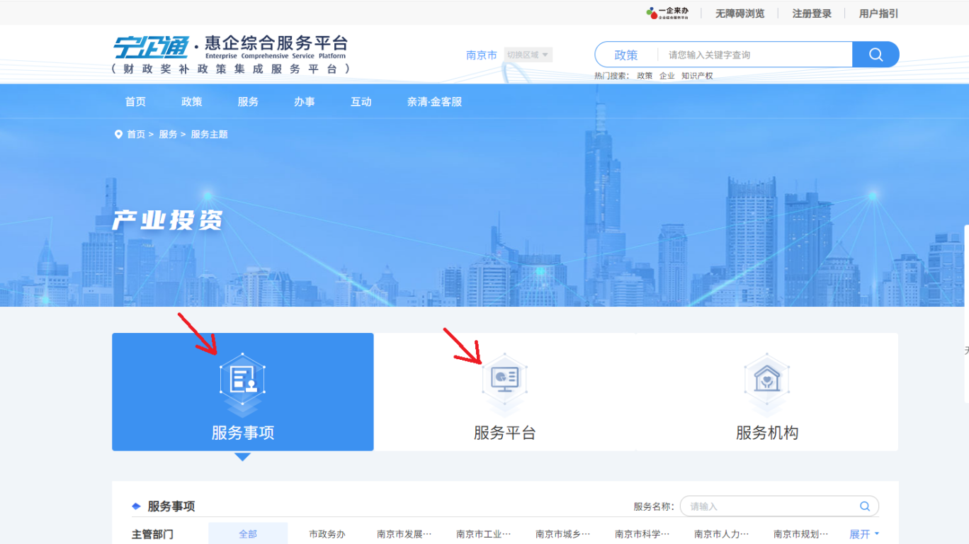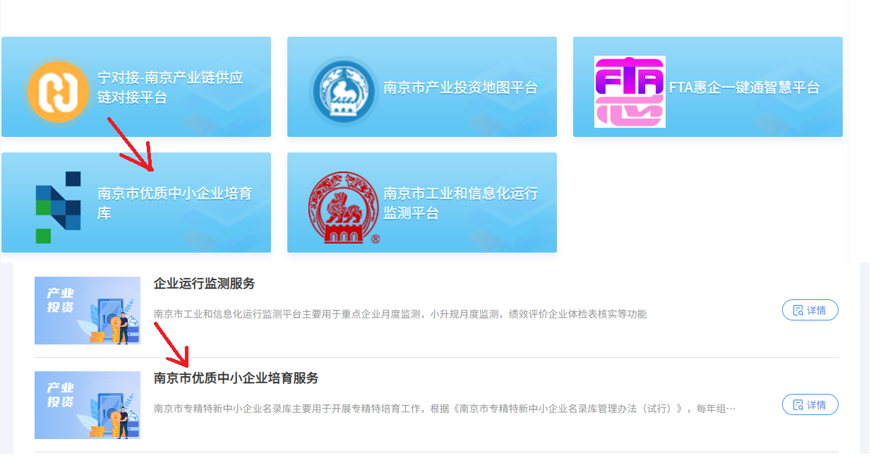 企业在登录“宁企通”惠企综合服务平台后,进入“服务”栏目,在“服务主题”中选择“产业投资”后,在“服务事项”或“服务平台”中,点击“南京市优质中小企业培育服务”或“南京市优质中小企业培育库”,即可在线填报信息。
