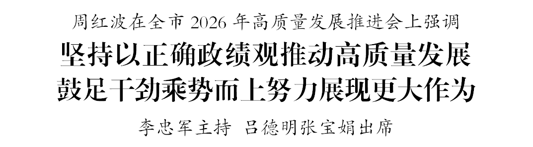 3月21日,市委、市政府召开全市2026年高质量发展推进会。市委书记周红波讲话强调,要深入学习贯彻习近平总书记参加江苏代表团审议时的重要讲话精神,更加自觉地以正确政绩观推动高质量发展,鼓足干劲、乘势而上,始终保持昂扬向上的拼搏姿态,以走在前、做示范、挑大梁的过硬成果,确保“十五五”开好局、起好步。市长李忠军主持,市人大常委会主任吕德明、市政协主席张宝娟出席。
