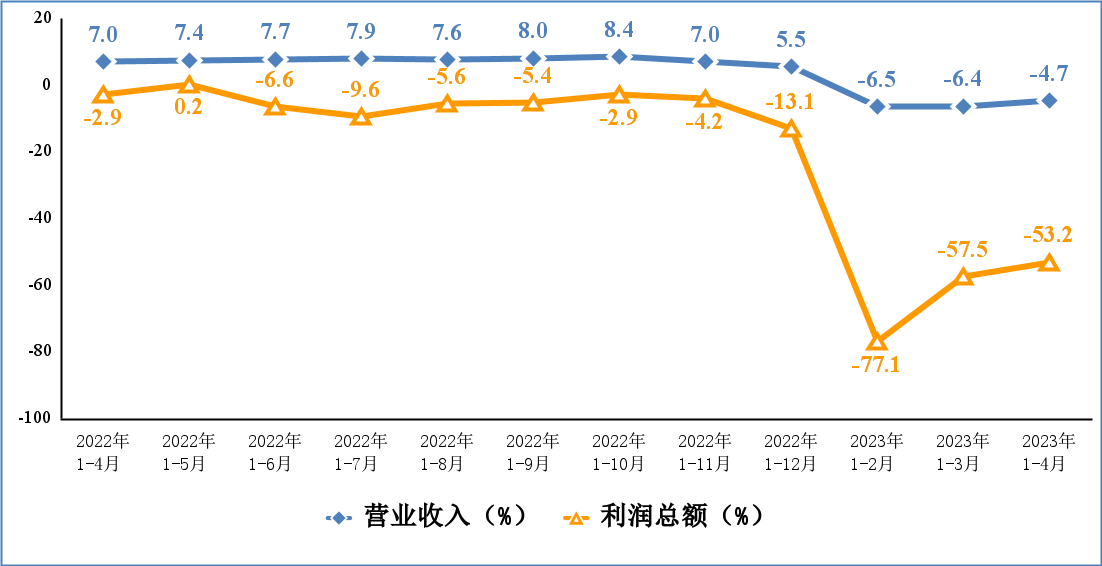 1-4月份,规模以上电子信息制造业实现营业收入4.31万亿元,同比下降4.7%,降幅较一季度收窄1.7个百分点;营业成本3.80万亿元,同比下降3.9%;实现利润总额861.6亿元,同比下降53.2%,较一季度降幅收窄4.3个百分点;营业收入利润率为2%,较一季度上升0.1个百分点。