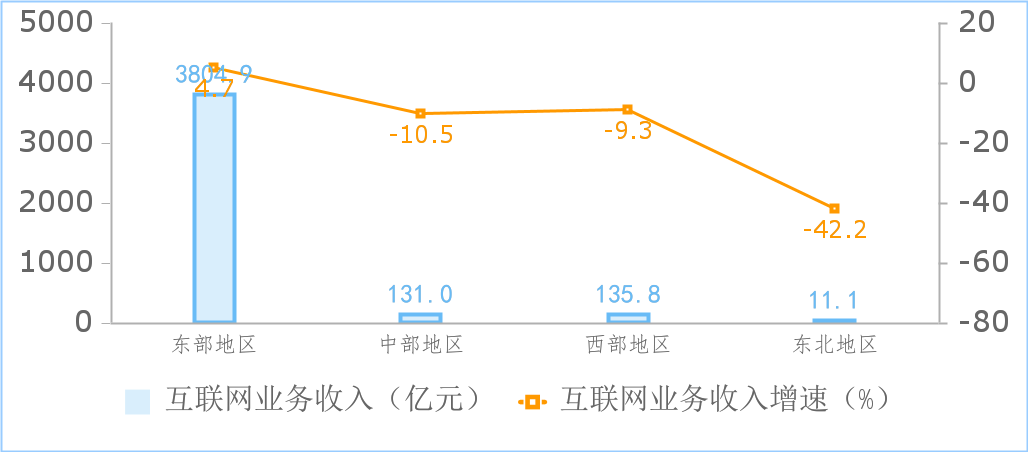 东部地区互联网业务收入加快增长。1-4月份,东部地区完成互联网业务收入3805亿元,同比增长4.7%,增速较一季度提高1.8个百分点,高于全国增速1.4个百分点,占全国互联网业务收入的比重为93.2%。中部地区完成互联网业务收入131亿元,同比下降10.5%,降幅较一季度收窄4.4个百分点。西部地区完成互联网业务收入135.8亿元,同比下降9.3%,降幅较一季度收窄0.2个百分点。东北地区完成互联网业务收入11.1亿元,同比下降42.2%,降幅较一季度扩大8.6个百分点。