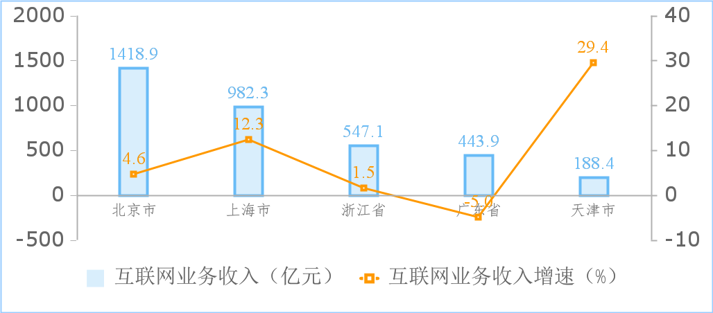 多数地区互联网业务增速实现正增长。1-4月份,互联网业务累计收入居前5名的北京(增长4.6%)、上海(增长12.3%)、浙江(增长1.5%)、广东(下降5%)和天津(增长29.4%)共完成业务收入3581亿元,同比增长5.9%,占全国比重达87.7%。全国互联网业务增速实现正增长的省(区、市)有17个,其中河北、广西、黑龙江、内蒙古4个省(区、市)增速超40%。