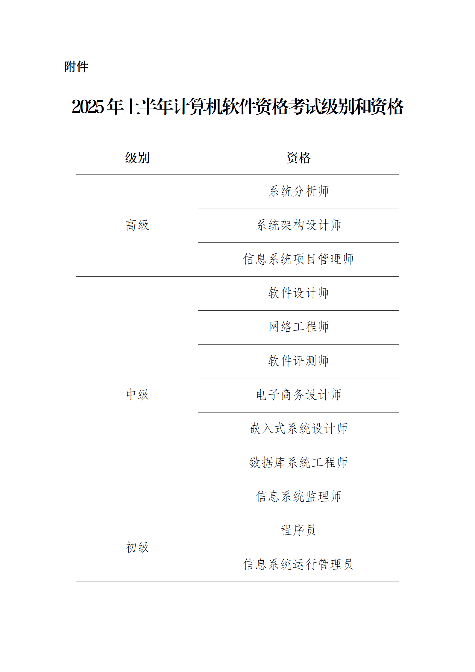 附件: 2025年上半年计算机软件资格考试级别和资格